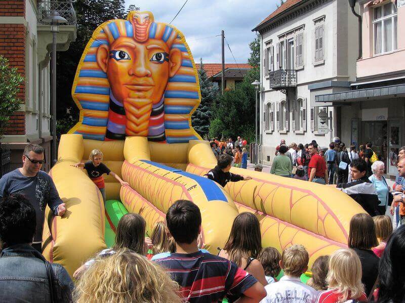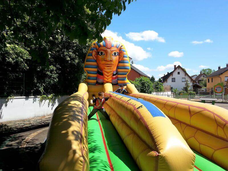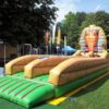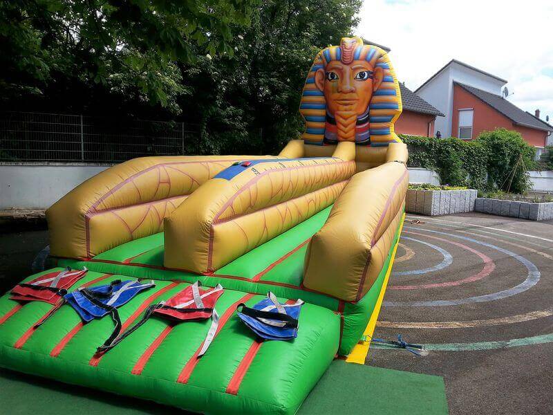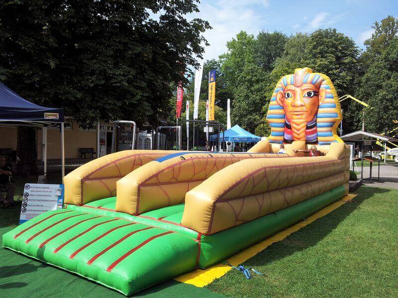 Mit seinen großen Abmessungen und dem Design im Stil der alten Pharaonen ist der Bungee Run Sphinx ein echter Hingucker. Doch nicht nur optisch bietet er ein riesiges Vergnügen für Jung und Alt. Die Teilnehmer werden mit einem Bauchgurt an ein Bungee-Seil fixiert und müssen so versuchen, ein Klettkissen möglichst weit vorne auf der sieben Meter langen Bahn zu platzieren. Um von dem elastischen Seil nicht sofort wieder nach hinten gezogen zu werden, sind Kraft und Geschick gefragt.