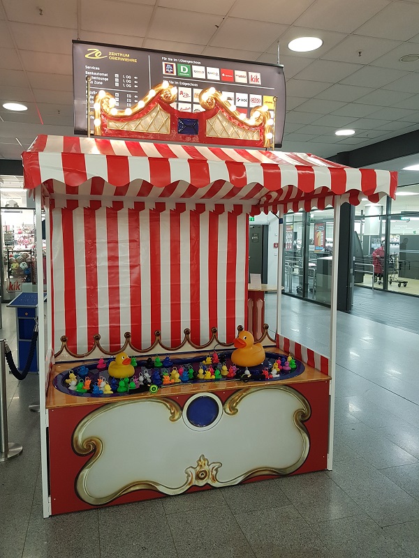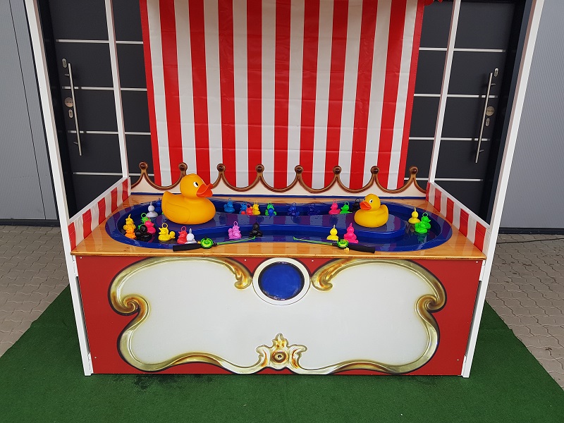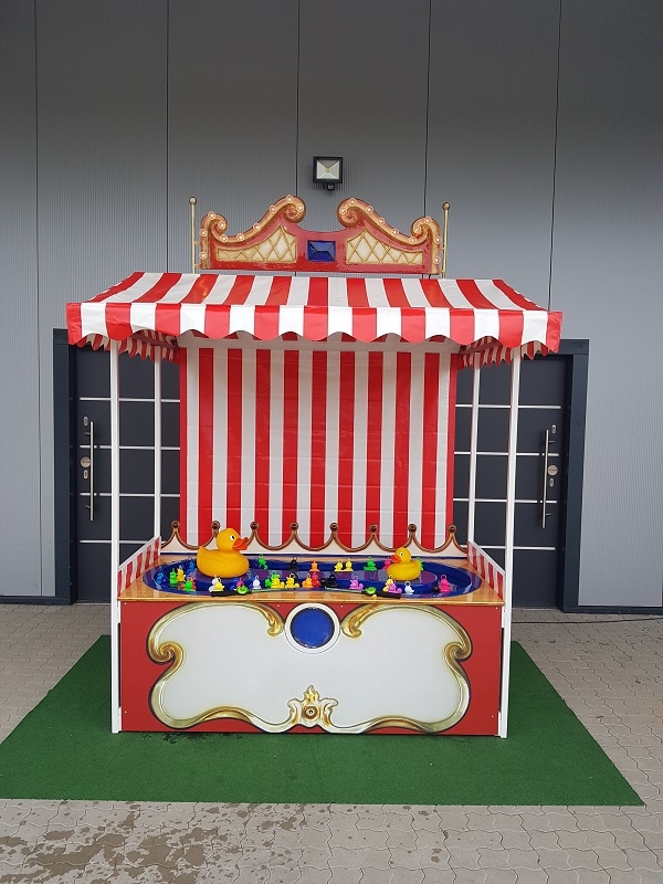 In dem Wasserbecken unter dem nostalgischen rot-weißen Dach ist Bewegung: Zahlreiche bunte Entchen schwimmen dank einer integrierten Pumpe im Kreis umher. Wem gelingt es, so viele von ihnen wie möglich mit einem Haken aus der Wanne zu angeln? Dabei kommen vor allem Ihre kleinen Gäste voll auf ihre Kosten, denn die Beckenhöhe ist auf sie abgestimmt. Zwei größere, fröhliche gelbe Enten beobachten das muntere Treiben und sorgen für gute Laune.