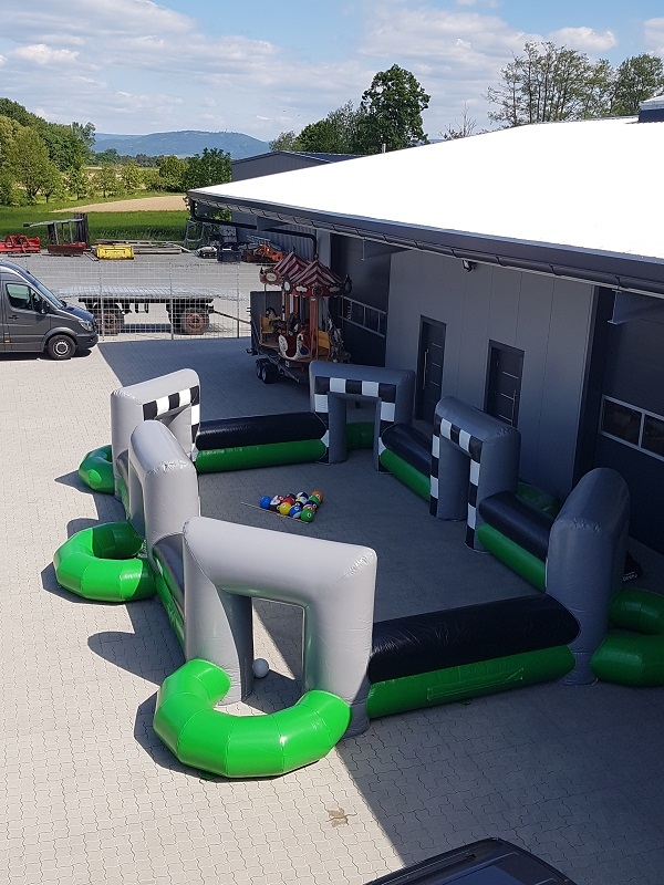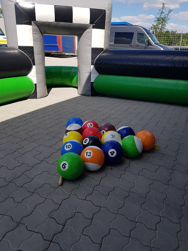 Das ist ein riesiger Spaß für Spieler und Zuschauer – nicht zuletzt dank der imposanten Größe unseres Fußball-Billard XXL. Es misst 9,50 x 7,30 Meter und kann auf verschiedenen Untergründen genutzt werden. Die Spielfeld-Umrandung wird ganz einfach mit Hilfe eines Gebläses aufgeblasen und ist so in kurzer Zeit einsatzbereit.