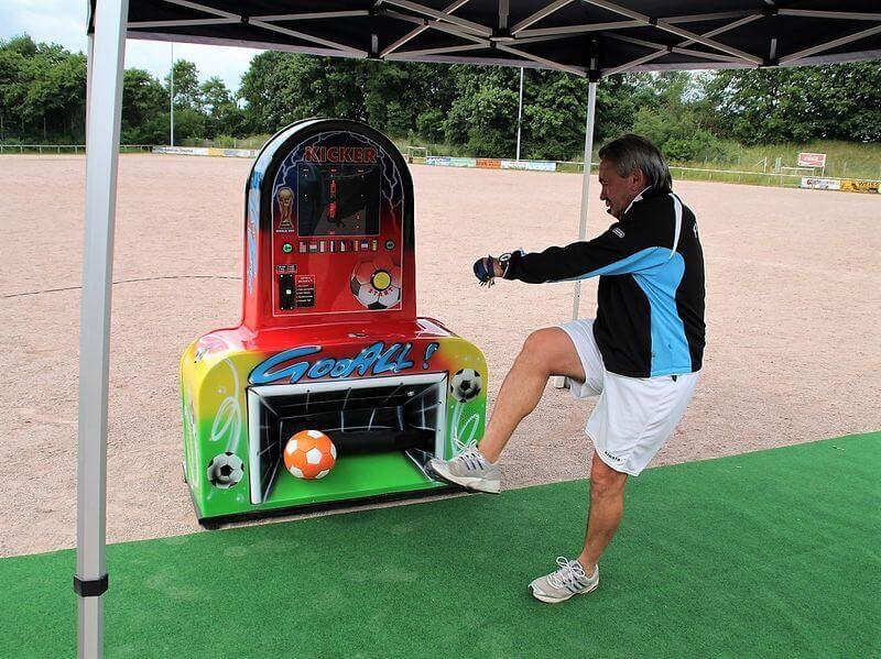 Beim Fußball-Schusskraftmesser zählen Taten und keine Worte. Er liefert den genauen Beweis, wer am härtesten schießen kann. Die Teilnehmer treten so kräftig wie möglich gegen den integrierten Lederball, der Computer misst die Schusskraft und zeigt sie sofort auf der Anzeigetafel an.