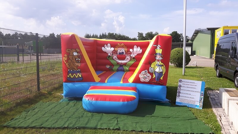 Der freundliche Clown lädt bis zu acht Kinder in die bunte Hüpf-Manege zum vergnügten Toben ein.