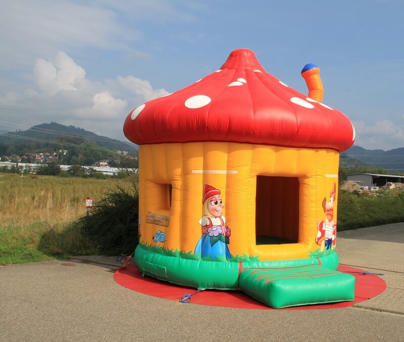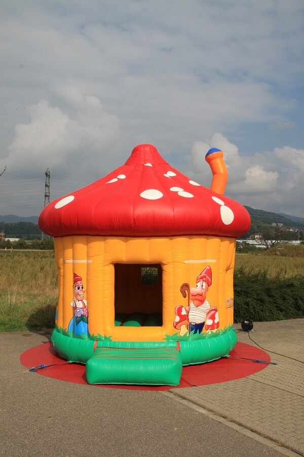 Mit ihrem Durchmesser von 6 m und ihrer Höhe von 4,5 m eignet sie sich hervorragend auch für kleinere Stellflächen. Durch das Dach unseres Fliegenpilzes sind die kleinen Hopser vor Regen sowie direkter Sonneneinstrahlung geschützt. Die Fenster der Hüpfburg dienen der Luftzirkulation im Inneren des Fliegenpilzes und sind zur Sicherheit mit Netzen versehen. Somit steht Kindern nichts im Wege, sich bis zur Erschöpfung auszutoben und einen zauberhaften Tag zu erleben.