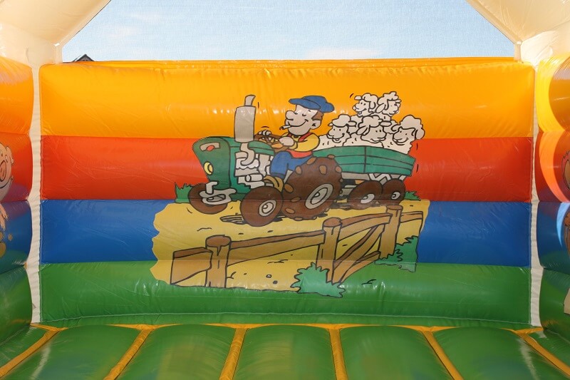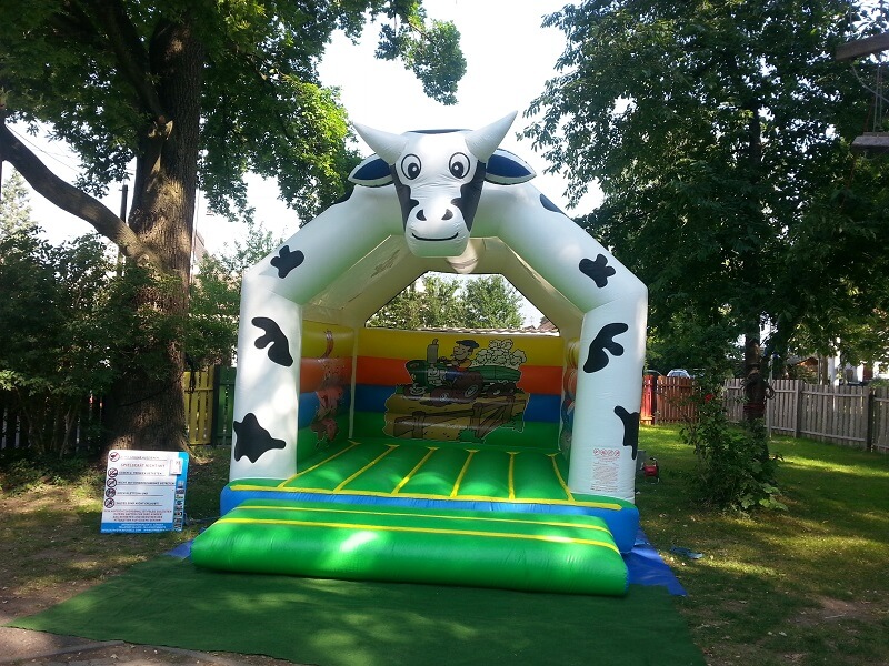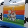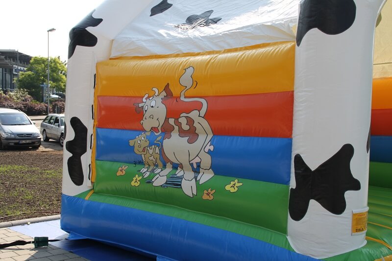 Auf unserer beliebten Hüpfburg „Kuh“ mit lustigen Bauernhofmotiven finden bis zu zwölf kleine Besucher Platz zum Hüpfen. Durch die Überdachung der Hüpfburg sind Sie nicht an sonniges Wetter gebunden und können den Kindern auch bei schlechter Witterung einen spaßigen Zeitvertreib bieten. Die an der Rückwand befindliche Öffnung dient zum Luftaustausch im Inneren der Hüpfburg.