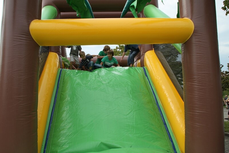 Diese grandiose Multiplay-Hüpfburg lässt kaum einen Kinderwunsch offen: Hindernisse, die durch Springen, Hüpfen oder Krabbeln überwunden werden müssen, eine Seil-Kletterwand und zum Abschluss eine große Rutsche. All dies bietet der Dschungelpfad gepaart mit einer riesigen, durchgehenden Hüpffläche (über 17 m lang!). Die gesamte Riesen-Hüpfburg ist durch Netze an den Seitenwänden gesichert, damit die kleinen Forscher ihre Entdeckungsreise sicher antreten können.