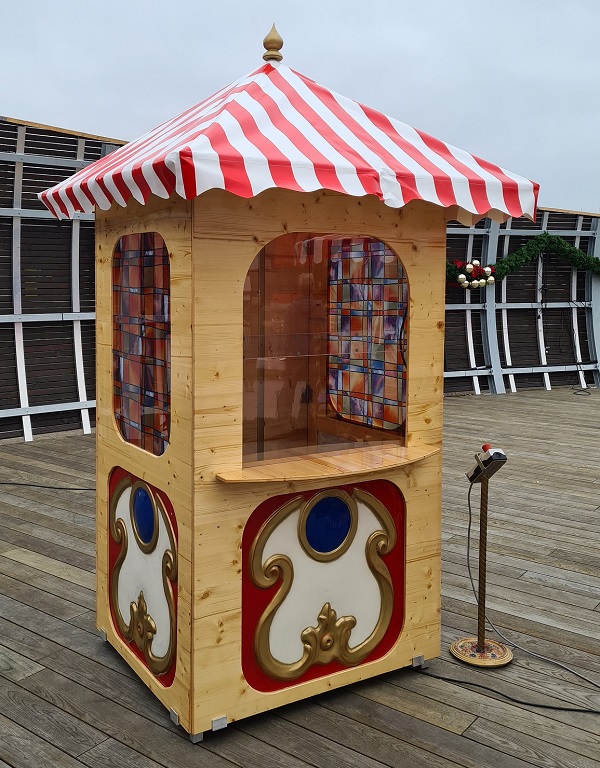 Unser stabiles Nostalgie-Kassenhaus hat die Maße 1,60 x 1,50 x 3,0 m und lässt sich im Handumdrehen auf- und abbauen. Sein Dach schützt ideal vor Sonne und leichtem Regen.
