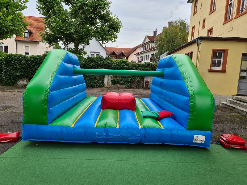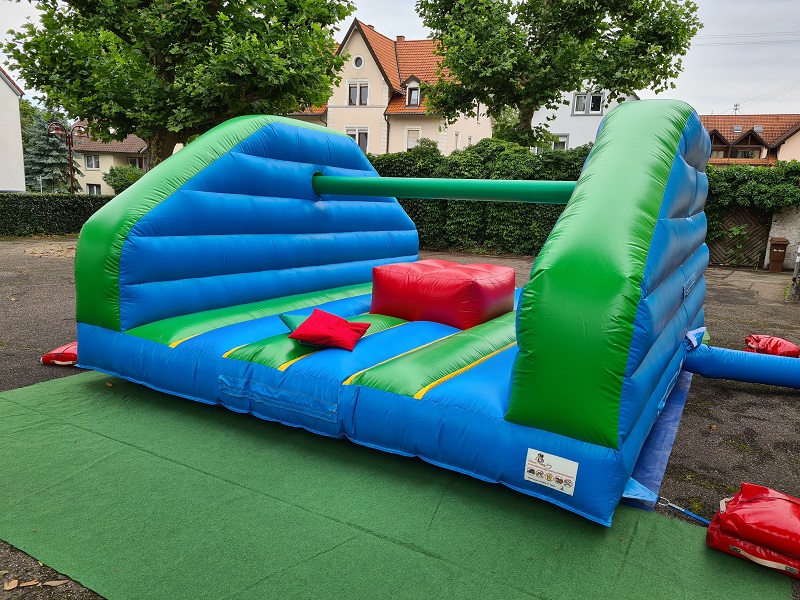 Diese Kissenschlacht hat es in sich! Statt im heimischen Kinderzimmer geht es hier auf einem riesigen aufblasbaren Eventmodul zur Sache. Zwei mit jeweils einem weichen Kissen bewaffnete Gegner stehen bzw. sitzen sich auf einer schmalen Stange gegenüber. Mit gezielten Kissen-Schlägen versucht man, den Kontrahenten so aus dem Gleichgewicht zu bringen, dass er von der Stange fällt.