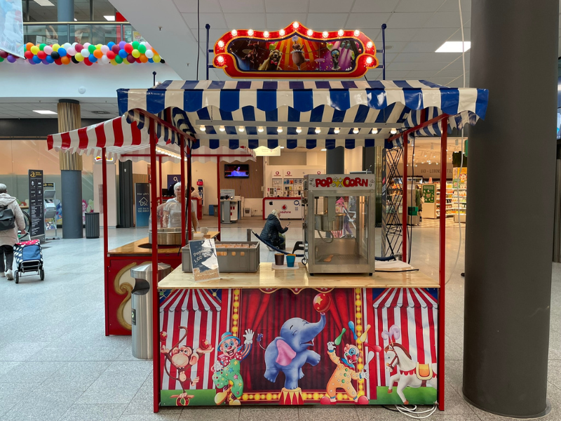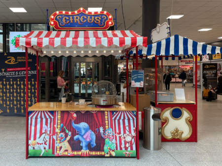Bei Spass-Events können Sie den Zirkus Marktstand allein oder in Kombination mit Spielen wie Pfeile werfen, Dosenwerfen oder Ringwerfen mieten. Zudem bieten wir verschiedene Fun Foods wie Popcorn, Zuckerwatte, gebrannte Mandeln oder Waffeln am Stiel, die Sie Ihren Gästen an dem Stand zubereiten und servieren können.