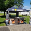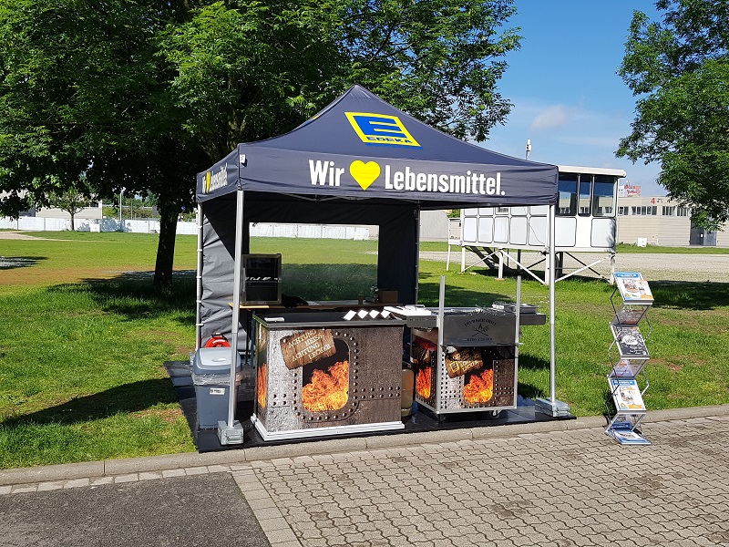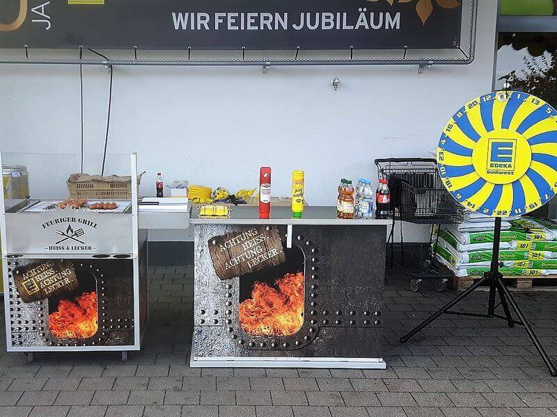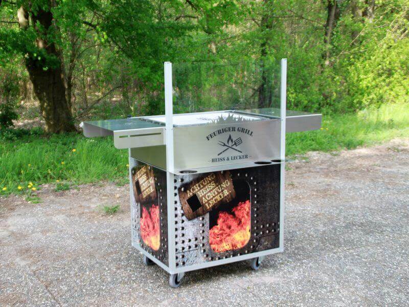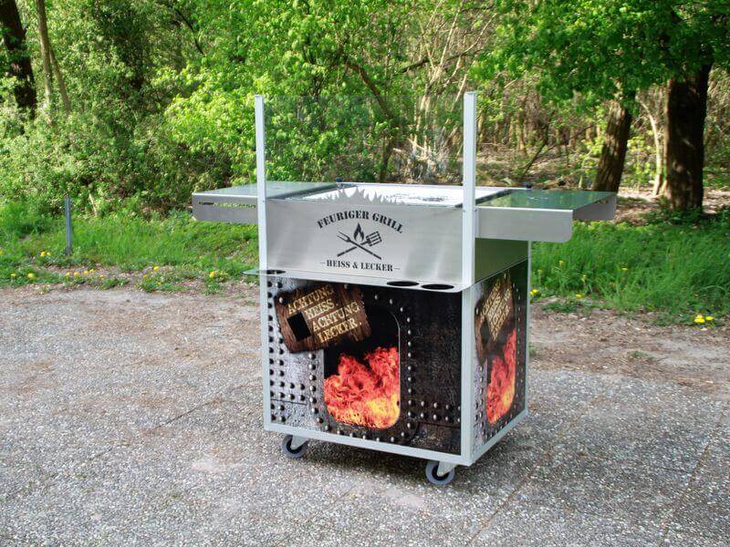 Die mobile Grillstation ist nicht auf externe Strom- oder Wasseranschlüsse angewiesen kann daher im Freien fast überall genutzt werden. Auf der Front ist ein individuelles Branding möglich, mit dem Sie beispielsweise auf Ihr Unternehmen aufmerksam machen können. Optional rüsten wir die Grillstation mit einer Überdachung aus, die vor Sonne und leichtem Regen schützt.