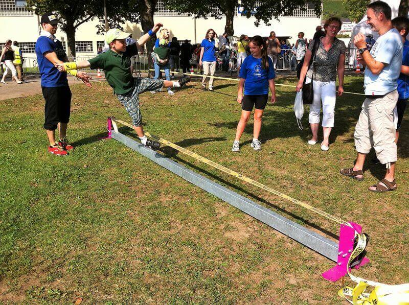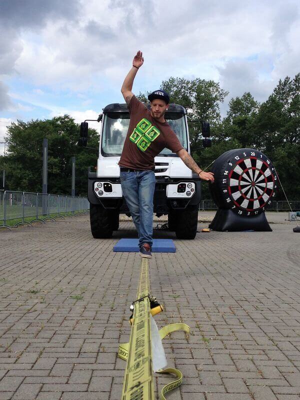 Normalerweise wird die Slackline zwischen zwei Bäumen gespannt. Dank unserer Slackline-Anlage benötigen Sie keine Bäume oder sonstige Ankerpunkte, wenn Sie Ihre Gäste über die Slackline balancieren lassen wollen. Das Seil wird in sehr geringer Höhe gespannt, so dass man sich zunächst an das ungewohnte Gefühl gewöhnen kann, ohne einen schweren Sturz befürchten zu müssen.