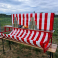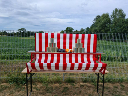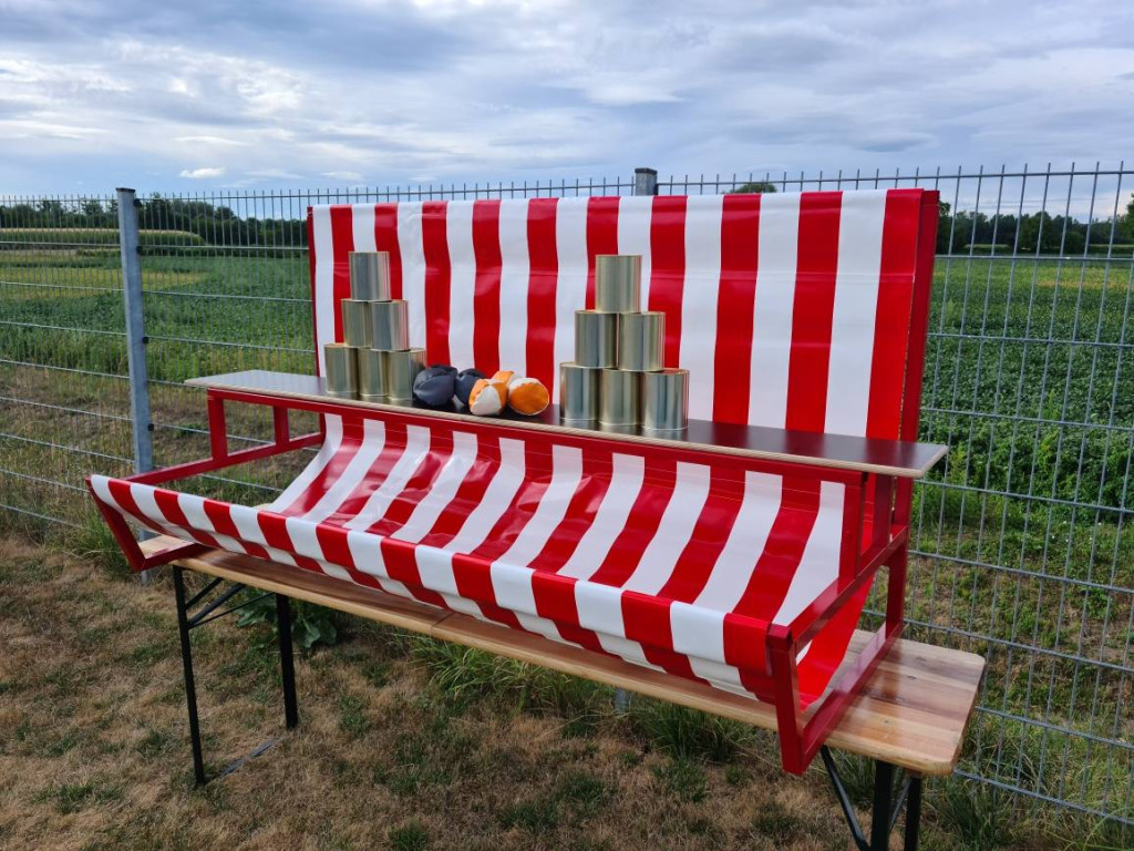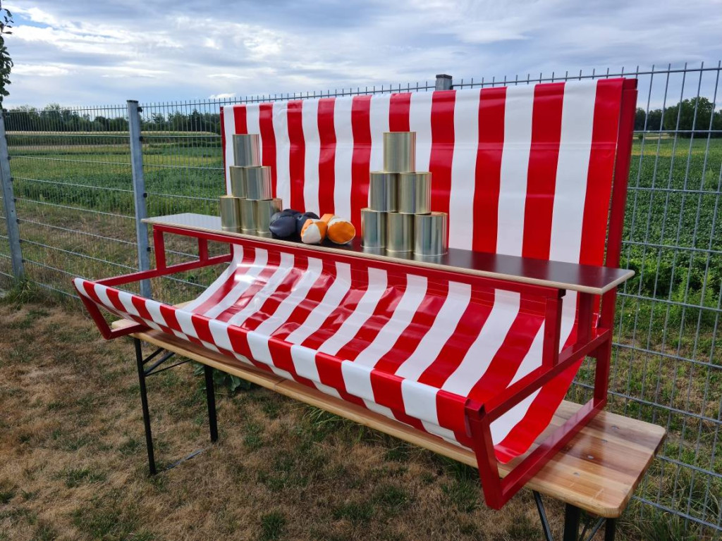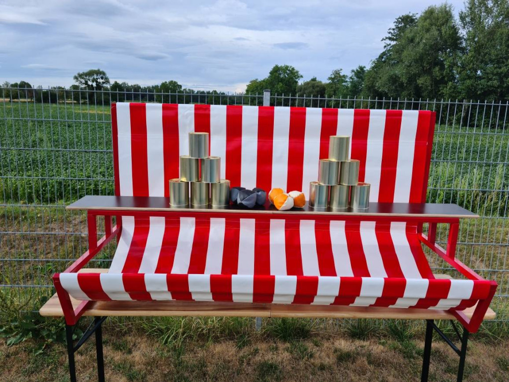 Dosenwurfstand, rot-weß gestreift mit 12 Dosen und 6 Bällen.