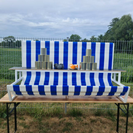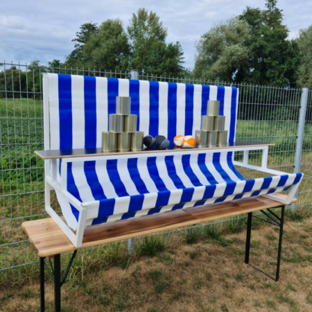 • Verkauf: Dosenwurfstand mit Dosen und Bälle / blau-weiß gestreift (NEU)