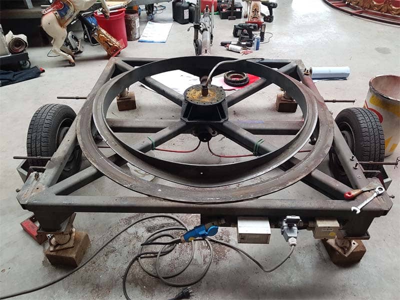 Hier sehen Sie einmal unser wunderschön nostalgisches Rhin-Schnooge aus eigener Herstellung, das kurz vor der Restauration steht. Der ganze Prozess beginnt zunächst damit, das Karussell in seine Komponenten zu zerlegen: Gerüst bestehend aus Eisenstangen, Fahrmodule, Eisengleis mit Rollen und die beiden Holzbodenplatte. Zunächst wird das Gerüst, wie hier zu sehen, abmontiert, sodass auch die anderen Bestandteile nach und nach mit einer Bohrmaschine abgelöst werden können.