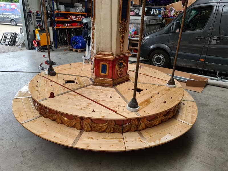 Alle Einzelteile sind restauriert? Dann kann Ihr Karussell wieder an den Start gehen. Wir montieren zuerst die lackierten Bodenplatten auf Ihrem mit neuem Zahnrad versehenen Eisengleis, die mit Schrauben und zusätzlichen Leisten gesichert werden. Danach werden die neuen Fahrgeschäfte aufmontiert. Mit unserem Service wird Ihr vermeintlich altes Karussell in neuen Nostalgie-Glanz getaucht!