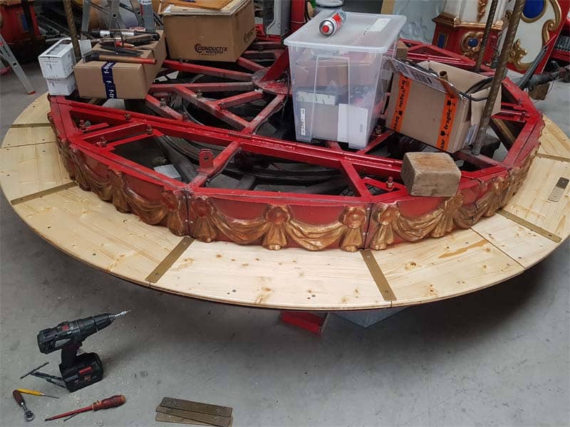 Der untere Teil eines Rhin-Schnooge wird von zwei Holzbodenplatten umsäumt, die zunächst abmontiert werden müssen, um sie ersetzen und die anderen Module wie das Eisengleis überprüfen zu können. Die Bodenplatten sind dabei nicht aus einem Stück, sondern aus mehreren Holzteilen zusammengeschraubt, wie eine Art Puzzle. Zunächst wird die erste Bodenplatte abgenommen, dann die Zweite. So arbeiten wir uns von unten nach oben durch das gesamte Karussell, um letztendlich alle Einzelteile sorgfältig restaurieren zu können.