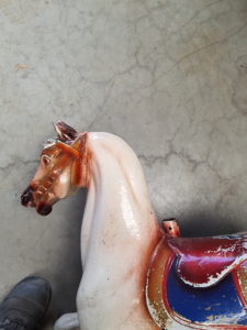 Hier sehen Sie eines der bekanntesten Fahrgeschäfte: das Pferd. Die aufwendige Bemalung ist immer ein Hingucker – die aber auch gepflegt werden muss. An diesem Beispiel sehen Sie, dass vor allem der Lack aufbereitet werden muss, da sonst das Fahrmodul anfällig für Regen und Nässe ist. Wir haben professionelle Lackierer in unserer Werkstatt, die sich darum kümmern, die abgenutzte Farbe sorgfältig abzubeizen, damit die frische neue Farbe auflackiert werden kann.