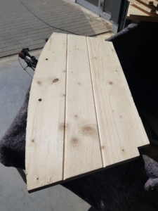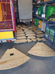 Da die Bodenplatte aus hochwertigem Holz bereits vorsichtig mit einer feinen Bohrmaschine aufgebohrt und in unterschiedliche Teile zerlegt wurde, können nun die Einzelteile ersetzt werden. Ist die Holzbodenplatte wie in unserem Fall marode und bedarf einer Auffrischung, werden neue Platten im selben Stil und in derselben Qualität zugeschnitten, wie hier zu sehen ist. So kann ein nostalgisches Fahrgeschäft einen hochwertigen Feinschliff erhalten und obendrein die Sicherheit Ihrer Fahrgäste gewährleisten: Ist die Holzplatte nämlich nicht mehr taufrisch, kann sich das Eisengleis lösen und im schlimmsten Fall das Fahrgeschäft. Mit unserem Service schlagen Sie also zwei Fliegen mit einer Klappe!