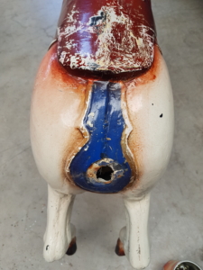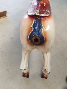 Pferde sind ja vor allem für ihren schönen Schweif bekannt. Anders als bei einem echten Pferd muss aber vor allem darauf geachtet werden, dass der Schweif regelmäßig restauriert wird, wenn Bedarf besteht. Dabei muss mit Sorgfalt und fachkundiger Expertise die Umrandung des Schweifes wiederhergestellt werden. In diesem Fall haben wir einen hochwertigen Kupfersaum ausgefräst und so lackiert, dass der Schweif nicht länger ausgefranst ist, sondern wieder den schönen nostalgischen Glanz bekommt.